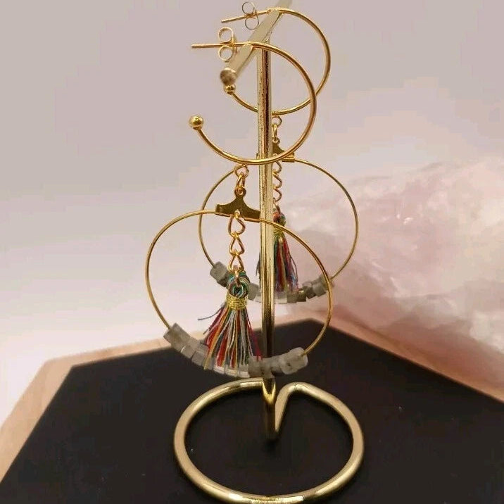 Boucles D'oreilles Pierre Naturelle Labradorite Grise Et Opaline Pom-pom