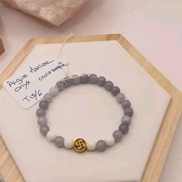 Bracelet en pierres naturelles – Aigue-marine & Onyx blanc avec Croix basque (lauburu) diamètre des perles 6mm