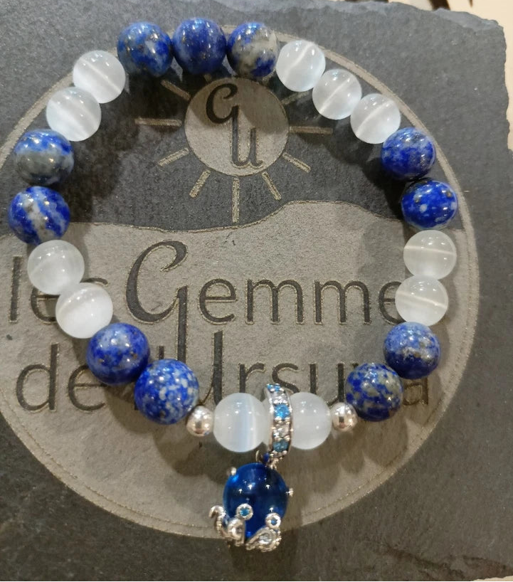 Bracelet en pierre naturelle lapis-lazuli et pierre de lune 8mm pendentif charms pieuvre argent.